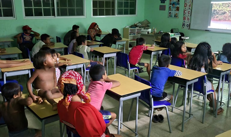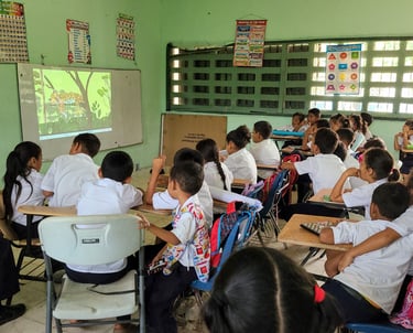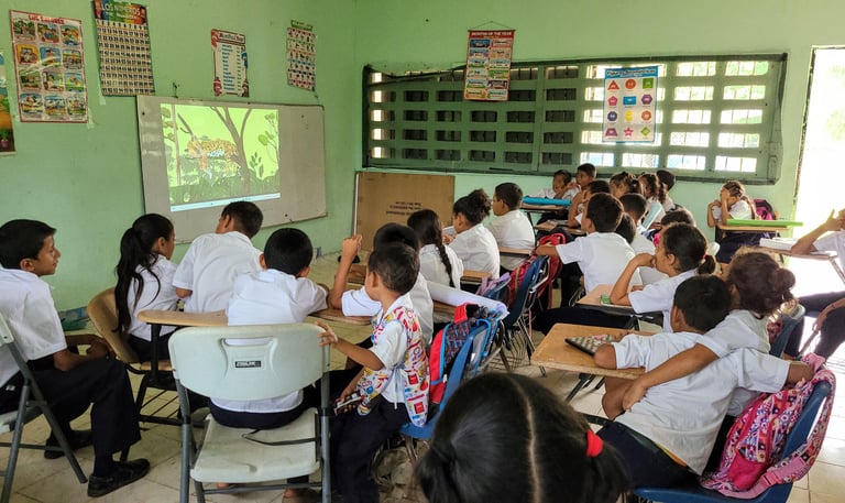 Kaminando's "Getting to Know the Jaguar" program provides educators with inquiry-based teaching materials, such as a forest and jaguar conservation manual, lesson plans, and educational activities available in Spanish and Kuna. The goal is to encourage and promote the natural curiosity of children, highlighting jaguar ecology and the importance of forest conservation, while inspiring future leaders. We also provide presentations for schools, tailored to different age groups and classes within each community. Our presentations include updates on our wildlife research and feature videos created by our team.
